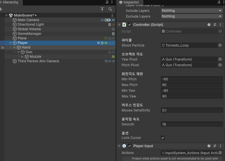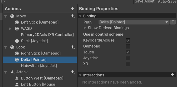 | 마우스 움직임이 Delta로 X, Y 좌표값이 아닌 화면상 마우스가 이동한 이동량에 대한 값으로 input actions에 설정이 되어있음 |