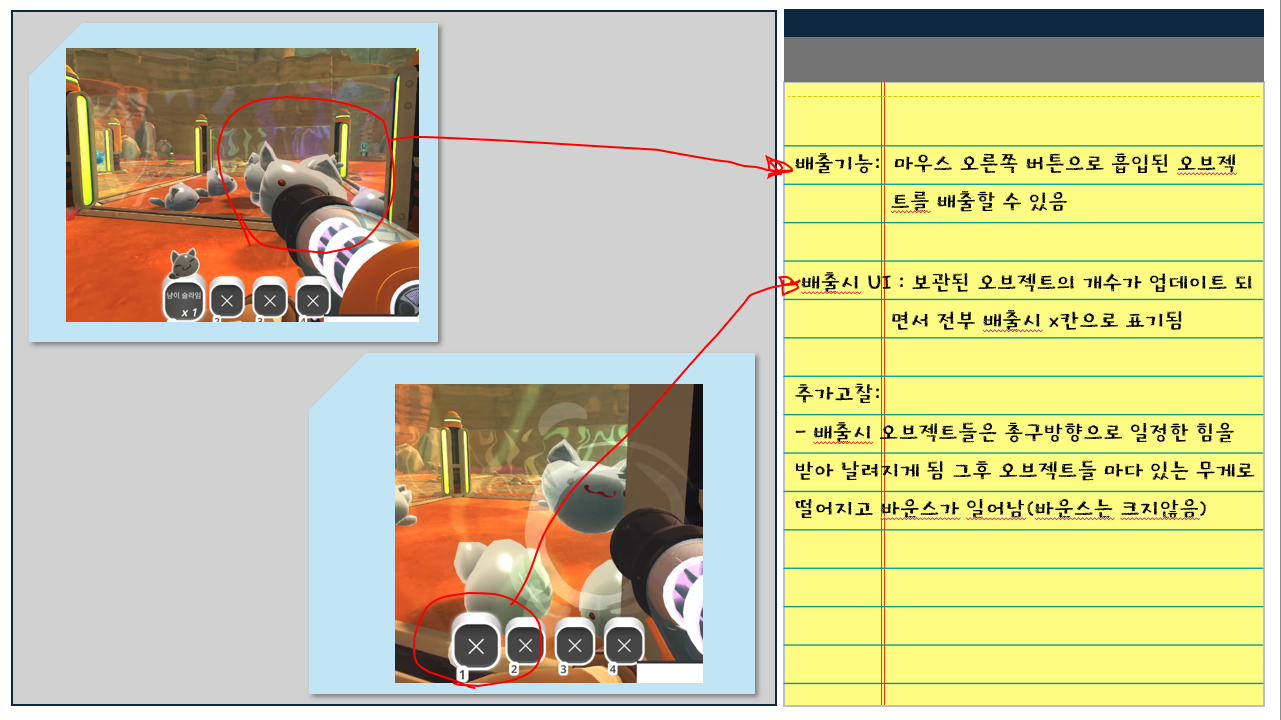 흡입했을때 오브젝트가 보관UI에 반영되고 배출시에도 보관 UI에 반영되는 UI업데이트까지 핵심으로 구현한후 +디자인, 사운드등 비주얼적인 부분도 행해질 예정이다