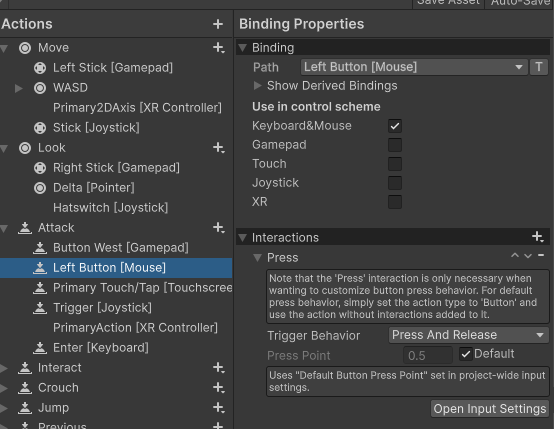 | 래퍼런스 게임인 슬라임 랜처의 흡입기능의 경우 Alt키를 '누르고 있는 동안' 모든 행동이 멈추고 마우스포인터가 나타남 그리고 UI 조작이 가능함(흡입기능이 꺼지면서 나오는 파티클도 꺼짐), Alt키를 땔때 슬라임건이 조작이 되며 마우스포인트가 사라지고 마우스는 화면에 갇힘 그리고 UI조작이 불가능해짐 그래서 록온 해제 버튼엔 Interactions 탭에 'Press' 기능을 추가하여 input action의 버튼이 눌릴때만이 아닌 땔때의 상황도 체크하도록 설정하는것이 중요함 |
